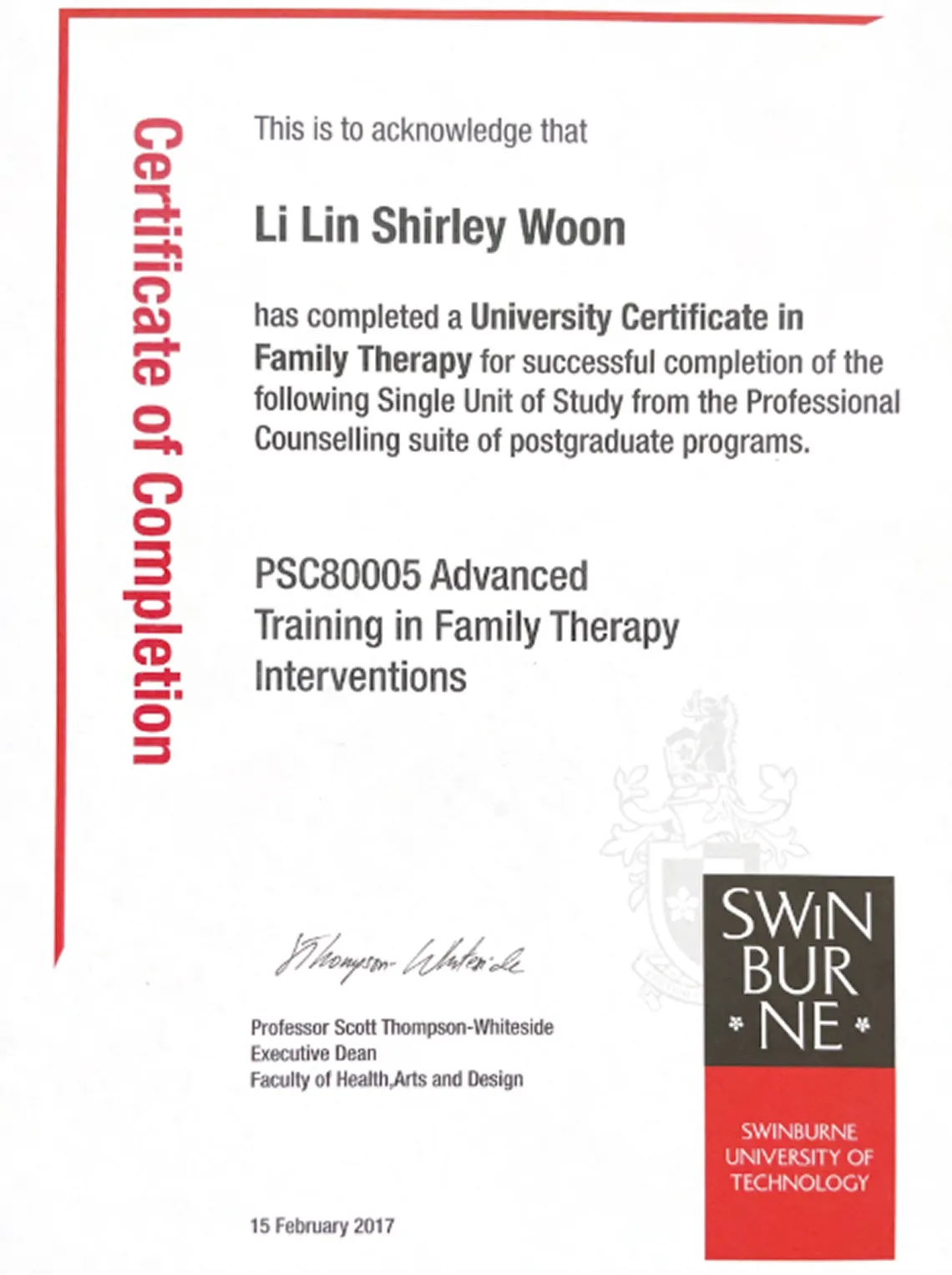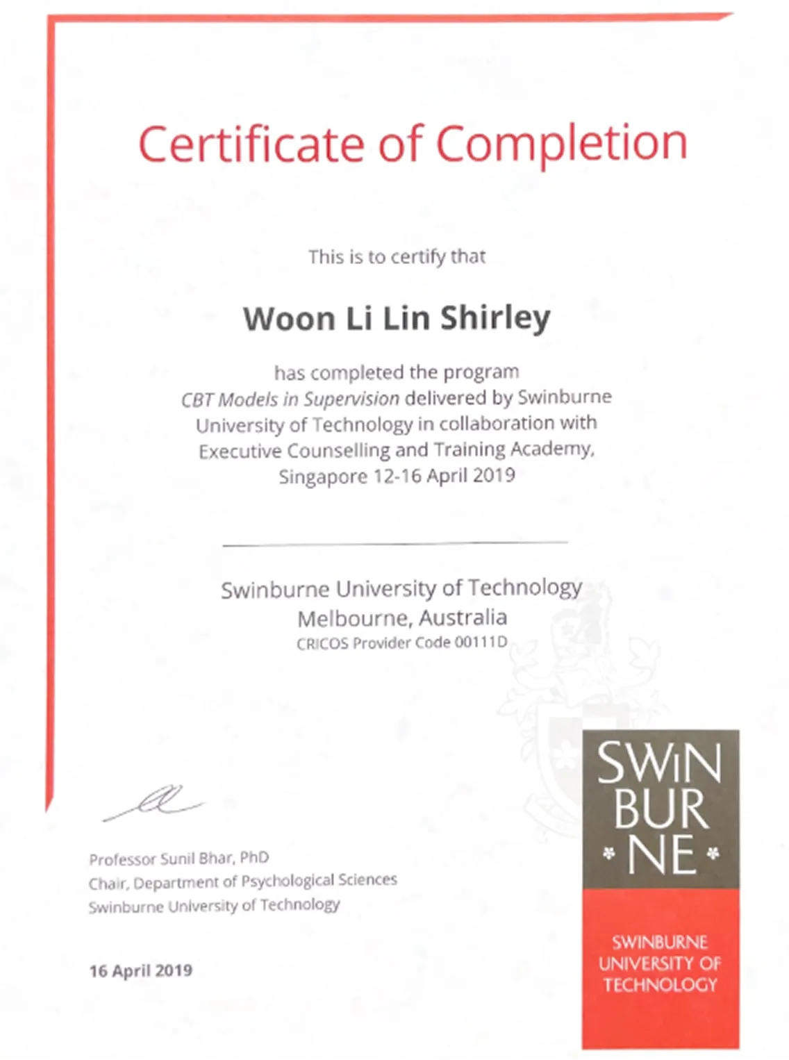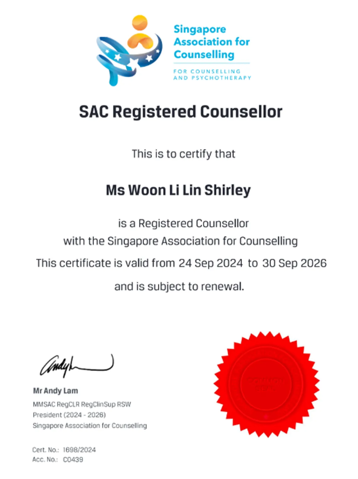 As a people helper, I am committed to my continuous professional education. My membership as a clinical registered member with the Singapore Association for Counselling has been renewed regularly.